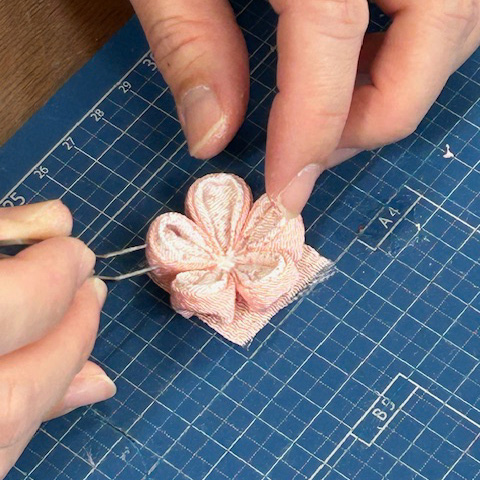 布を折りたたみ、花びらをひとつひとつ作り上げる